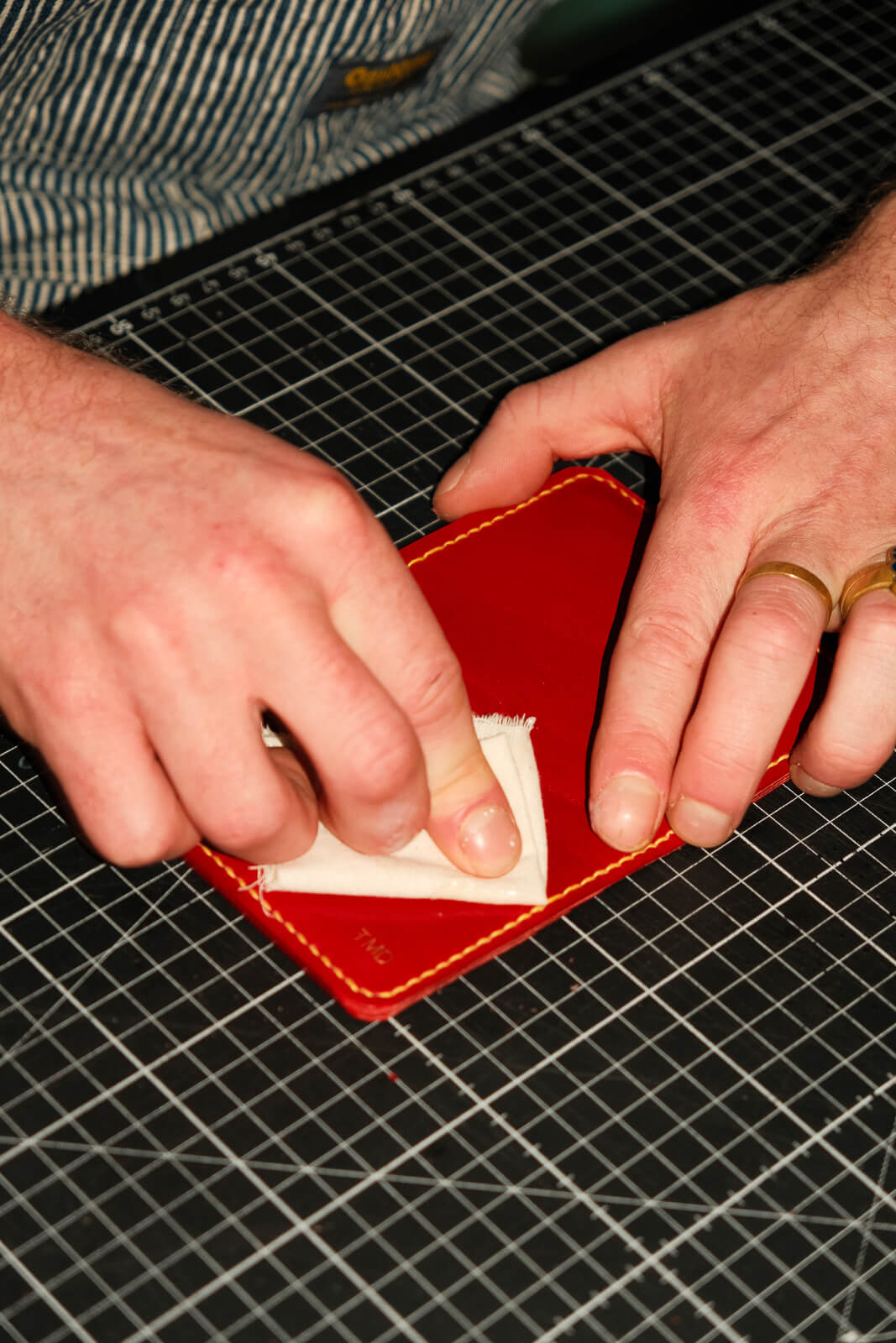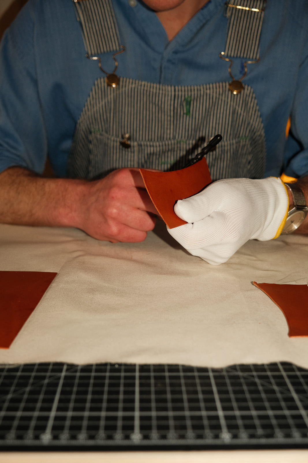 Nous utilisons des chutes de cuir pleine fleur pour l’extérieur de nos accessoires en cuir—reconnu comme la partie la plus noble et durable de la peau. Sa texture naturelle, riche en caractère, développe avec le temps une patine unique à son propriétaire, rendant chaque pièce plus personnelle à l’usage.