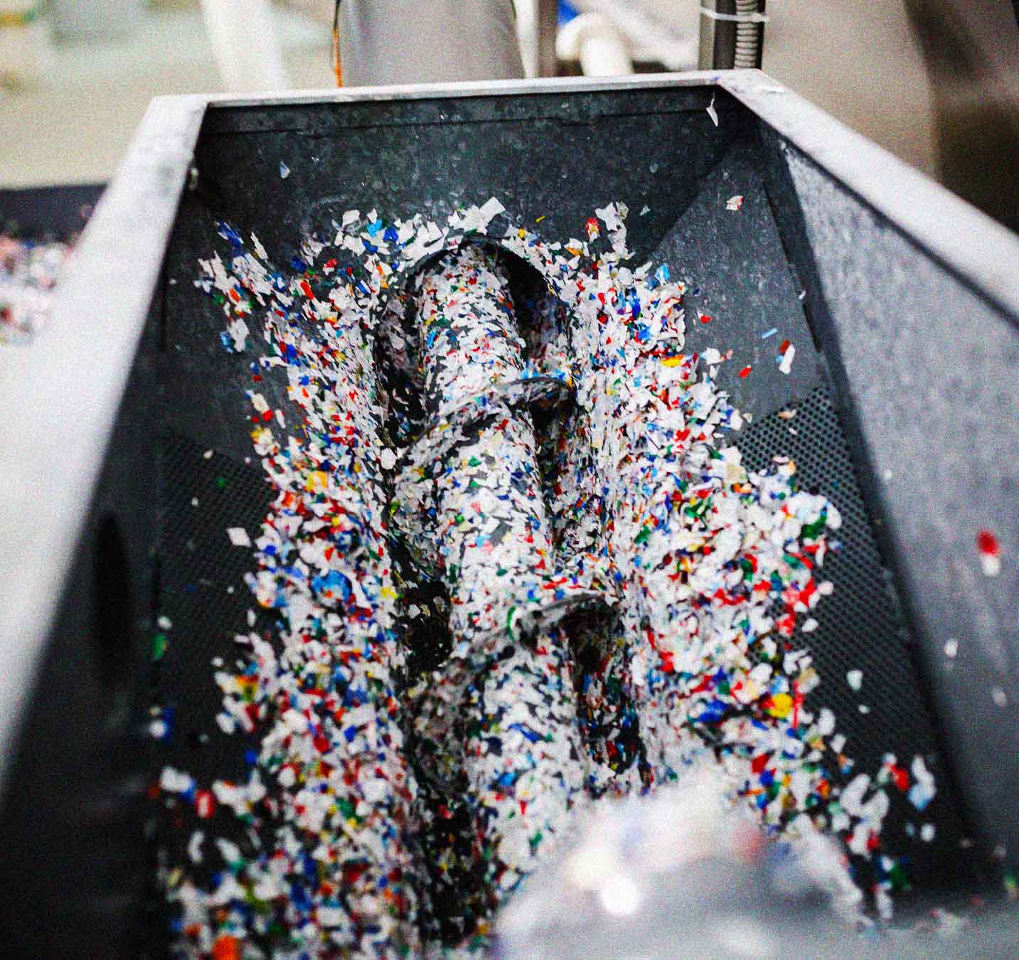 Petit à petit, nous réduisons les déchets plastiques en morceaux afin de faciliter leur transformation en tissu.
